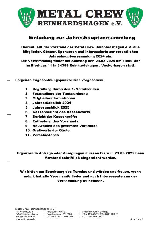 Hiermit lädt der Vorstand der Metal Crew Reinhardshagen e.V. alle Mitglieder, Gönner, Sponsoren und Interessierte zur ordentlichen Jahreshauptversammlung 2024 ein. Die Versammlung findet am Samstag den 29.03.2025 um 19:00 Uhr im Bierhaus 11 in 34359 Reinhardshagen / Veckerhagen statt.